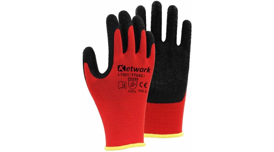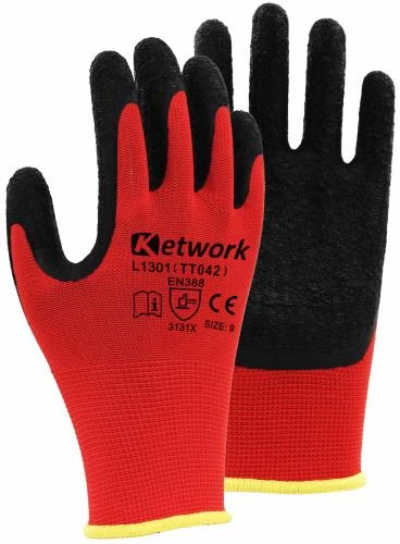 KET TT042 - L1301 (GLK+NP) Tenyérmártott piros kesztyű, gyűrött fekete LATEX mártással 8-11-ig